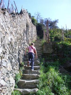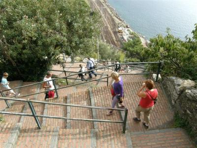 Drugi dan smo se peljali do Vernazza, od tam peš. Pot se je zopet dvigala, na srečo pa ni bilo veliko stopnic. Alenka je zagrozila, da ji stopnic ne sme nihče več omenjati vsaj tri mesece. Prišli smo na nadmorsko višino 190m (o tem in o drugih podatkih te obveščajo table ob poti), nato pa se hodi skoraj ravno, pred mestom pa se zopet spusti. Do Corniglie smo hodili uro in pol. Seveda smo si mestece ogledali, na ozkih ulicah pa smo srečali slovensko družino, ki je potovala z avtom. Zanimivo je, da niso bili preveč navdušeni nad mestom, mi pa smo jim hiteli razlagati našo varianto poti in kaj vse smo zato videli. Seveda, če se samo voziš z avtom, veliko zamudiš.