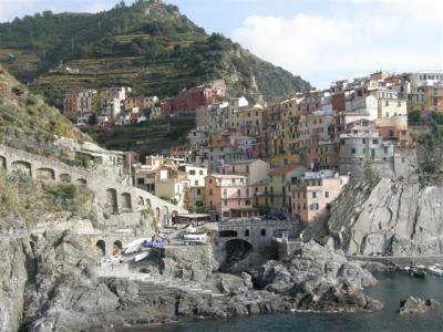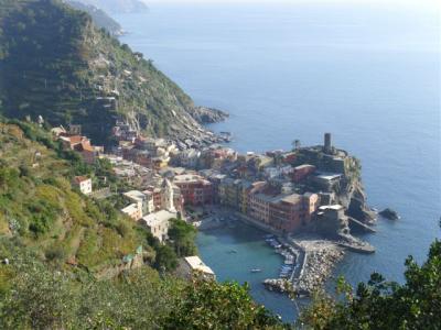 Do Vernazza smo hodili približno dve uri in pol. Ker smo upoštevali nasvet in začeli hoditi od zadnjega mesta nazaj proti La Spezii, smo bili nagrajeni s pogledom na mesto. Le-ta so zgrajena na skalah in to na eni strani, tako da če prideš z druge strani, ne vidiš mesta v celoti. Vernazza nas je vse očarala. Hiše tesno skupaj, vsaka z drugačno barvo fasade. Žal pa je tisti dan bil pogreb deklice, ki se je smrtno ponesrečila in vsi lokali so bili zaradi pogreba in žalovanja zaprti. Bili smo tam, ko je po glavni ulici šel sprevod s krsto, za njo pa vsi vaščani. Žalostno.