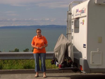 Zjutraj sva se že pred osmo uro spakirala in v prečudovitem jutru zajtrkovala na vrhu prelaza Arlberg. Na AC sva se priključila spet na prvem priključku onstran prelaza. Ta del AC je nekaj časa tudi le navadna dvopasovnica. Piše celo, da je nevarna. Peljala sva mimo Bregenza in v Lochau prestopila A-D mejo. Potovala sva po severni strani Bodenskega jezera.