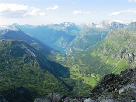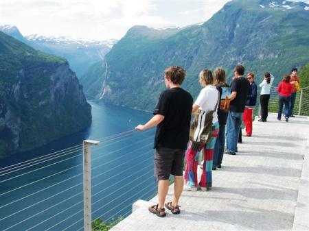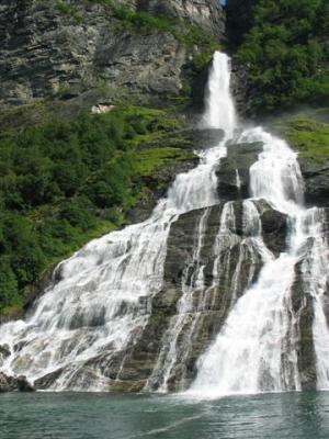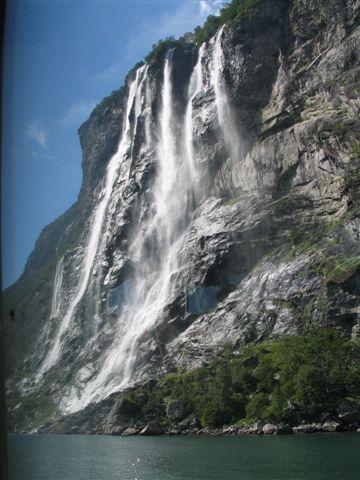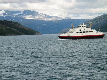 Pred trajektom vstopne linije s prečnimi črtami 0,5 m narazen, niti pomislim ne na to, da bi se izdajal za krajšega od 6 m. 131 NOK (16.4 €) za kamper z voznikom in 22 NOK (2.8 €) osebje. Po vsej verjetnosti moj zadnji norveški trajekt v življenju. Hura, veselje je neizmerno. Po 10 minutni vplovbi s hitrostjo 22 km/h pokažem sredinec trajektu in napad s severa na tako opevani Geiranger fjord se lahko začne. Pred spustom po serpentinah v sam konec fjorda ustavimo na razgledni točki visoko nad fjordom. Končno en resen fjord. Po kar poštenem spustu parkiramo v mestecu (N62,10055 / E7,2057) in se vkrcamo na turistično ladjico (110 NOK (13.4 €) odrasli, 45 NOK (5.6 €) otroci), ki nas v slabih dveh urah popelje do začetka fjorda in nazaj. Lep izlet, iz visokih sten okoli fjorda pada navzdol množica slapov. To bi bilo kar škoda zamuditi, čeprav nas po ladijskem zvočniku lokalni vodič baše z nekimi bajkami o teh krajih. Na ladji spoznam prijeten parček, ki raziskuje Norveško v obratni smeri z enoprostorcem GO registracije. Zagotovo bodoča avtodomarja!