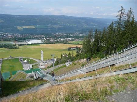 Zjutraj mi žilica ne da miru. Ta skakalnica mora biti nekje v bližini. Res se po slabih 200 metrih znajdem na samem zaletišču, odpre se mi pogled na spodaj ležeče mesto, mogočno reko in gozdove na nasprotni strani doline. Celo vreme je pretežno jasno. Spodaj na parkirišču ob skakalnici vidim nekaj kamperjev, med njimi je tudi Jurijev. Tako zgodaj ga res ne bom budil. V gozdu je še nekaj malega ostankov borovnic in gob. Po zajtrku se posadki peš odpravita navzdol ob skakalnici, oba kamperja, Goran in jaz gremo seveda po cesti. Parking pod skakalnim centrom je velik, raven in celo zastonj (N61,12298 / E10,48599). Naprava je pokrita s plastiko, ob 10 uri fantje že veselo trenirajo. Lepa zadeva, tik nad mestom, ki se najbolje vidi z vrha zaletišča.