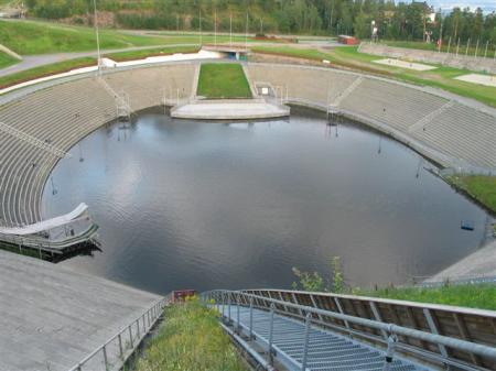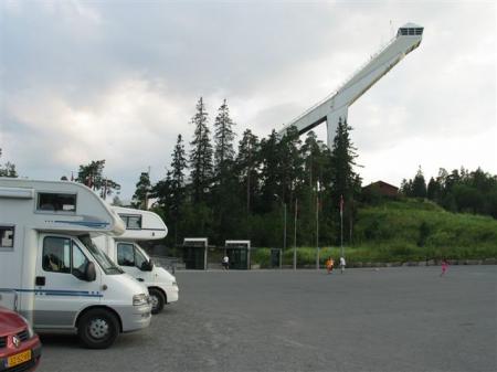 Po ogledu olimpijske skakalnice se zapeljemo navzdol v mesto, na črpalki še zadnjič natočimo to obupno drago norveško nafto, napolnimo zalogo vode, se za hipec ustavimo še na parkirišču muzeja Mulhausen (N61,1134 / E10,4773), kjer samo nekoliko pretegnemo noge. Teh raznih bajt, ki so videti od zunaj v muzeju na prostem imamo že polno kapo. Ob 13 uri smo že na cesti za Oslo. Pred ogromnim in dolgim jezerom Mjosa nadaljujemo po zahodni strani, cesta tukaj pelje večinoma ob jezeru. Ob obali si poiščemo prostor za kosilo in si privoščimo kar dolg odmor. Končno! Po siesti se odpeljemo do Holmenkolna, skakalnice v Oslu. Na začetku mesta kar naenkrat spet neke cestninske mitnice. Pozno popoldne parkiramo na zgornjem parkirišču, tik pod naletom skakalnice (N59,96609 / E10,66644). Vstopnina 70 NOK (8.8 €). Haloooo? Gremo raje malo peš tam okoli. Na drugem vhodu vprašam, če lahko samo malček pogledamo po hrbtišču skakalnice, pa nas kar spustijo noter, češ itak že zapiramo in se kart ne pobira več. V izteku je celo kakih 10 m globok bazen, primeren za plavanje.
