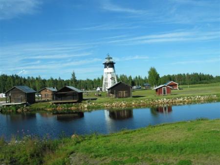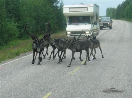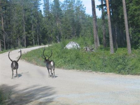 Po mirni noči v zalivu že ob 8 uri zapustimo Luleo, kmalu v mestu Tore zavijemo navzgor in mimo dolgih jezer kar naenkrat prečkamo polarni krog. 50 km pred mestom Pajala, kjer mi GPS javlja naslednjo črpalko, se mi prižge lučka za rezervno gorivo. Ni problema, za 50 km bi pa moralo biti razerve v tanku. Žal ni tako, 5 km pred črpalko se prižge še rdeča lučka za napako v motorju, lahko samo še zavijem ob cesto. Očitno je poraba pri 100 km/h prehuda, da bi rezerva zdržala teh ubogih 50 km. Ker imamo vedno s seboj 10 litrsko kantico z nafto, je problem hitro rešljiv. Rezervoarje z nafto in vodo napolnimo v Pajali, v bližnji trgovini pa punce kupijo še svež kruh. GPS nas kmalu obrne v desno proti finski meji, ki jo preko večje reke prečkamo brez ustavljanja. Takoj pademo na makadam, delo na cesti. Na srečo je delovišče kratko in kar lepa cesta nas ob mejni reki med Švedsko in Finsko pelje proti severu. Pokrajina je neka mešanica med tajgo in tundro, drevesa in lišaji. Na cesti se vsake toliko pojavijo severni jeleni, ki se mirno sprehajajo med čakajočimi avti.
