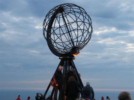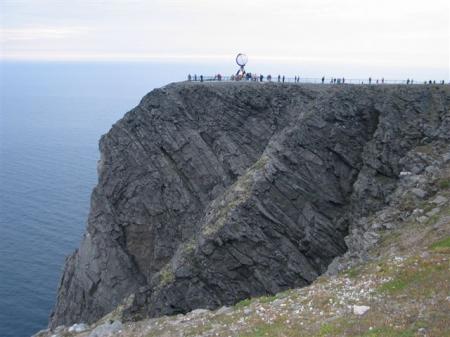 Cesta pelje ob dokaj slikoviti obali in ob 21:30 uri v belem dnevu prevozimo tunel pod morjem, ki povezuje celino z otokom Mageroy, na katerem leži Nordkapp. Na izvozu iz tunela na otoku sledi plačilo tunelnine. 460 NOK (57.5 €) za kamper, daljši od 6 m, ki vključuje tudi voznika in 47 NOK (5.9 €) za vsakega potnika. Jasno, da so razen sopotnice vsi ostali poskriti po kotih. Za osebna vozila in kamperje, krajše od 6 m je cena 145 NOK (18.1 €). Barabe, več kot trikratna razlika za daljše od 6 m. Sledi vožnja mimo presenetljivo velikega in delno industrijskega mesta Honningsvag, ki kar nekako ne sodi v to okolje. Nato sledi precej strma gorska cesta čez prelaz Skipsfjordfjell in znajdemo se pred ciljem. Še prej pa pred mitnico, kjer sledi plačilo vstopnine, 195 NOK (24.4 €) po osebi. Cena karte vključuje vstop v neke oglede muzeja in videopredstavitve. Študentska vstopnica je 110 NOK (13.8 €). Naši študenti so tudi tokrat nevidni, malo je vseeno treba vrniti milo za drago tem severnim nategunom. Nekaj čez deseto uro zvečer smo na najvišji točki Evrope (N71,16843 / E25,77995). Vreme je presenetljivo lepo, delno oblačno, piha veter. Kratke rokave zamenjajo bunde, vetrovke in kape. Pri dnevni svetlobi zdržimo dolgo v »jutro«. Še posebej naše punce so tokrat za spremembo daleč od zaspanosti. Zdravljica in Slovenija, odkod lepote tvoje odmevata na Nordkappu. Nori Slovenci.