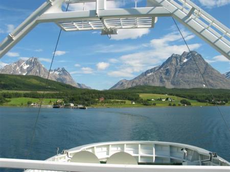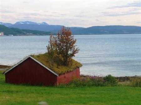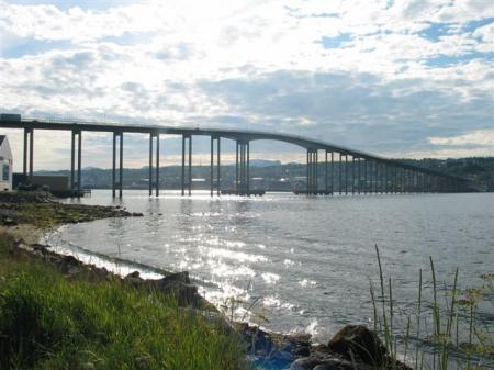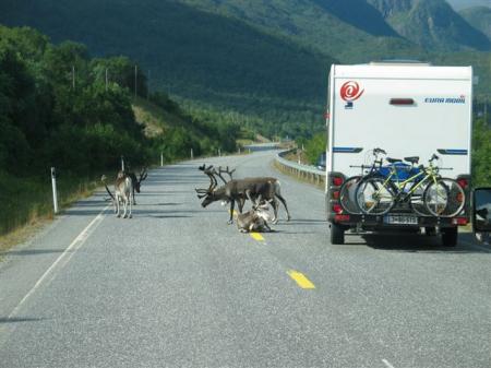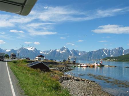Mirna noč, ponoči spet dežuje, vendar je jutro sončno. Vreme se tukaj očitno spreminja iz ure v uro. Že zvečer smo se odločili, da gremo ob 9 uri naprej do Tromse-ja. Pokrajina se počasi začne spreminjati, smo že v bližini fjordov. Nekaj km obalne ceste obnavljajo, hujše kot v Albaniji, vendar na srečo kmalu mine. Spet se pojavijo ob cesti severni jeleni. Nekateri ležijo na sredinski črti in se ne pustijo motiti. Šef bande ima okoli vratu celo zvonec, očitno so vse te živali tukaj udomačene. Iz obalne ceste se odprejo prelepi pogledi na bližnje visoke gorske vrhove na otokih, pokrite s snegom. Nekateri so visoki tudi čez 1000 m. Temno skalovje se dviga iz modrega morja, na vrhovih ogromne zaplate belega snega, res lepo.