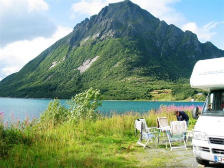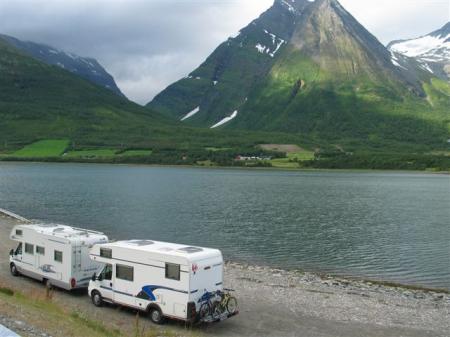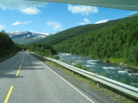Lakotniki iz ozadja kamperja zahtevajo svoje in kosilo naredimo na makadamskem parkirišču na celini, kakih 500 m pod prej omenjeno cerkvijo. Jureti gredo s kolesi nazaj čez most v raziskavo mesta, naši študenti se čez pol ure spomnijo, da bi tudi oni to pogledali. Odpeljem jih v center in jih vržem ven pred korzom. Že čez pol ure nenadna sprememba vremena iz sonca v dež. Nazaj po mladince, tega mesta imamo dovolj, gremo prespat nekam bližje Narviku. Jureti še ostanejo, dobimo se jutri nekje na poti. V Tromse-ju natankamo še obupno drago nafto (11 NOK (1.4 €) / L), po kaki uri vožnje z Goranom v Laksvatnu zavijeva na obalno cesto, mogoče bo kje kakšen lep parking ob morju. Končno se le prikaže nekaj primernega na koncu fjorda Balsfjorden pred mestom Nordkjoshbotn (N69,2245 / E19,5049). Lep pogled preko fjorda na visoke hribe, na njih sneg, vidi in sliši se slapove, ki se vijejo do morja prav z vrha gora. Stole, mizo in vino pospravimo okoli polnoči in spet spat pri belem dnevu. Še dobro, da so na oknih žaluzije, da lahko v kamperju pričaramo noč.
