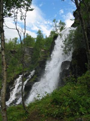 Po zajtrku gremo naprej, današnji cilj je Andenes. Ko se vsedem za volan in vklopim CB, me še isti trenutek po zvočniku prestraši Jurij, ki se prav takrat pripelje mimo iz Tromseja. Spet se v konvoju nastavljamo radarjem, nameščenim v obcestnih škatlah. Verjetno smo poslikani po vsej dosedanji poti. Med potjo, pri Smogstadu opazimo tablo za polarni živalski vrt. Gremo pogledat, mogoče se nam prikaže celo kakšen los. Na velikem parkingu (N68,69198 / E18,11277) je možno celo natočiti vodo, praznenje WC-ja računajo 50 NOK (6.3 €). Humoristi. Toda z vstopnino se ne hecajo. 160 NOK (20 €) za odrasle, 90 NOK (11.3 €) za otroke, 350 NOK (43.8 €) za družino z otroki od 3-15 let. Tukaj srečamo Stipičevo Euro, ki prihaja navzgor iz Lofotov. Tip omenja neke kampe na Lofotih, očitno še en humorist. Mi samo dotočimo vodo in se raje odpeljemo nekaj km nazaj do parkirišča pod večjim slapom (N68,71684 / E18,10397). Po lahki gozdni stezi smo v 10 minutah na vrhu mogočnega slapu, naredimo nekaj fotografij in že se peljemo naprej.