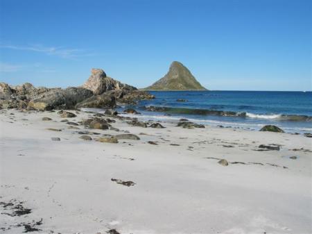 V Storfossnu zavijemo desno in se po obalni cesti počasi bližamo Lofotom. Pred mestom Sortland nadaljujemo navzgor po lepi cesti, ki pelje po vzhodni strani vse do vrha otoka Andoya in do ribiškega mesta Andenes. Tukaj je možen izlet z ladjo in ogled kitov, vendar je 100 € na osebo za nas prehuda ovira. Po zahodni, atlantski strani otoka se odpeljemo nazaj proti jugu. Tukaj so baje lepe peščene plaže. Jurij res kmalu po kakšnem kilometru makadama izven mesteca Bleik najde sanjsko plažo (N69,26509 / E15,91394). Ni kaj, tukaj bo očitno padel nekajdnevni počitek. Ob polnoči opazujemo sončni zahod pri belem dnevu. Sonce se izredno počasi skrije v morje in po nekaj urah se spet malo naprej prikaže iz vode.