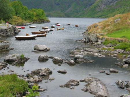 Malo poslikamo, naberemo celo nekaj borovnic in zaradi slabega vremena in še slabše napovedi poskusimo v bližnjem trajektnem pristanišču (N67,90047 / E13,04651) srečo z nakupom vozovnic po tarifi, nižji od 6 m. Če uspe, gremo čez lužo na celino v Bodo, če ne, spet nazaj navzgor po Lofotih. Nepošteno priznam, da sem nekaj čez 6 m, mogoče kakih 30 cm, vendar se nas na vsesplošno začudenje trajektna punca usmili in zaračuna 687 NOK (86 €) (kamper + voznik 538 NOK + sopotnik 149 NOK). Kar se mene tiče, zapuščam Lofote za vse večne čase. Mogoče nekaj lepša pokrajina ob obali teh zadnjih 30 km, višje zgoraj pa nič posebnega. Dostopov do obale večinoma ni, le-ta pa je tudi skalnata in s polno algami. Skratka, glede na silno hvalo smo vsi nekoliko razočarani. Slike na raznoraznih prospektih iz ptičje perspektive so res lepe, iz kamper perspektive pa bistveno manj. Vkrcavanje na trajekt poteka izredno počasi, vsi potniki morajo zapustiti vozila. Vožnja traja 3,5 ure, na začetku se v lepem salonu na udobnih stolih pogumno lotimo kartanja. Po prvih nagibanjih ladje opustimo vse nadaljne aktivnosti in se vsak po svoje upiramo začetku morske bolezni. Punce s prekomernim govorjenjem, meni še najbolj pomaga poskus spanja. Ostane seveda samo pri poskusu, vendar nekako preživim to guncanje. Zdaj sem še bolj prepričan, da me bo težko kdo spravil recimo na ladjo za Grčijo. Ob pol dveh ponoči pristanemo v Bodo-ju in se v dokaj temni noči odpeljemo do 32 km oddaljenega obcestnega parkinga, kjer so baje znane nekakšne skalnate formacije (N67,24076 / E14,71381).