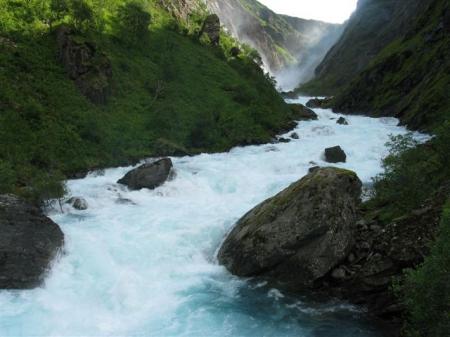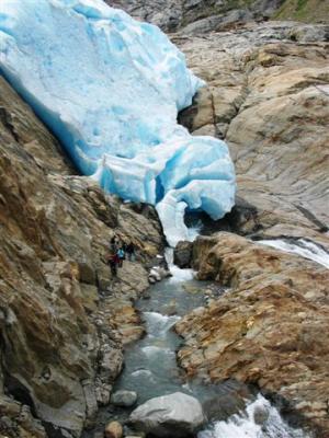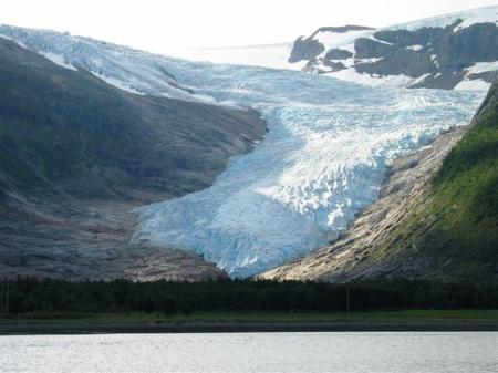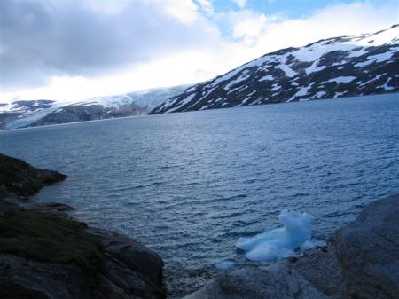 Spet se zbudimo v rahlo deževen dan. In to ob 7 uri zjutraj, kajti prva ladjica krene čez fjord že ob 8 uri. Če bi se držali ure, bi gladko čakali na naslednjo ob 10 uri, odplula je namreč kar nekaj minut prej. Če Jurij nebi zadržal kapitana, bi spet čakali v prazno. Po 10 minutah vožnje nas ladjica odloži 3 km pred ledenikom. Pešačimo 1 uro po lepi cesti ob jezeru, ki je nastalo pod ledenikom, nato plezamo po skalah, ki so zaradi množice različnih plasti res nekaj posebnega in že smo v bližini samega konca ledenika. Le-ta se končuje kakih 50 m nad morjem, iz njega teče manjša reka po skalah v jezero. Kar impresivna zadeva, vsekakor vredna ogleda. Še malo izzivamo srečo tik ob plavkastem ledu, potem pa na sprehod nazaj do ladjice in kamperja.