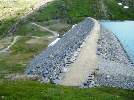 Sledi mladini obljubljen ogled dolin z jezovi, ki so ga priporočili Juriji. Odpeljemo se kakih 15 km nazaj, spet skozi 7 km tunel in tik za njim (N66,79368 / E14,00093) zavijemo na stransko asfaltno cesto, ki nas ob slikoviti reki s slapovi in skozi mračne in ozke tunele pripelje pod kamnito pregrado ledeniškega jezu na severni strani ledenika Svartisen (N66,75254 / E14,1012). Splezamo na široko pregrado, odpre se pogled na ledenik, ki sega prav v jezero, okoliške gore so še polne snežnih zaplat. V jezeru plava celo nekaj odtrganih gmot ledu. Odpeljemo se še na drugi odcep nekaj nižje, ki prav tako pripelje na vrh drugega jezu.