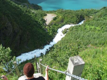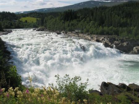Zjutraj spet sonce. Nekaj km naprej ob naši poti so slapovi Lakfossen, kjer naj bi bilo polno iz vode skakjočih lososov. Da vidimo. Zavijemo z glavne ceste in po slabem kilometru smo na parkirišču (N65,62522 / E13,29129) nad slapom. Širok slap višine kakih 10 m mogočno buči preko skal, o kakšnih skakjočih lososih ni ne duha ne sluha. Ko se po stezici približam obali, vseeno vsake toliko zagledam kakšno ribjo glavo, ki pokuka iz vode. Kaki dve, verjetno iz gimnastične ribje ekipe naredita celo manjši preval nad gladino. Se mi pa zdi, da mi tudi tisti dve, ki pomolita glavo ven, kažeta jezik, ker naj bi okoli govoril, da tale Norveška ni nič posebnega in da naj si te svoje obupno drage trajekte kar nekam vteknejo.