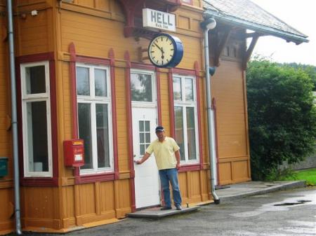 Nadaljujemo do Gronga, kjer dotočimo razmeroma poceni nafto in pomalicamo (N64,46451 / E12,31631) ter oberemo nekaj lokalnih malin. Spet prične deževati. Kakih 30 km pred Trondheimom zavijemo v vasico s pomenljivim imenom HELL in tam naredimo nekaj slik pred njihovo železniško postajo z istim imenom. Saj ne vem, ali prihajamo v pekel, ali odhajamo iz njega? Hm, da ni mogoče oboje?