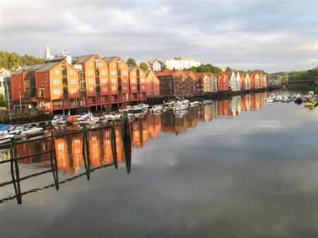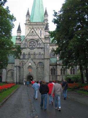 Pred Trondheimom dvakrat cestnina. Prvič 10 NOK (1.3 €) in po nekaj km še dodatnih 25 NOK (3.1 €). Drobiž vržeš v nekakšen pisoar, obešen na cestninski postaji, ni rampe, prižge se samo zelena luč. En uvoz zraven je avtomatski, tega norvežani samo prevozijo. Mi smo seveda pošteni in napolnimo WC. Namen imamo poiskati parking v mestu, ker pa so Jureti že pred nami v mestu, gremo na njihove kordinate. Skozi mesto, mimo centra, nato plezamo nekam v hrib izven mesta, kjer je nek ljudski muzej z imenom Sverresborg Folksmuseum (N63,42125 / E10,35641). Parking in vreme sta primerna edino za kosilo, ko dež poneha gremo spet nazaj navzdol v mesto. Zaradi sobote je verjetno šolsko parkirišče nasproti velike katedrale tako prazno (N63,42814 / 10,39441). Ker se v katedrali pripravlja nekakšen koncert in ljudje pravkar vstopajo vanjo, seveda izkoristimo priložnost. Temačna notranjost, slikanje prepovedano, kmalu smo nazaj na ulicah Trondheima. Zanimivo mesto, veliko lokalov, množice ljudi v njih in pred njimi. Prav zanimive face, nekako odbite. Kako šele mi izgledamo za njih? Po sprehodu se odločimo za odhod proti jugu. Ni nam za spanje v mestu, kjer ta večer na glavnem trgu koncertrira neki Toto. Baje neverjetno znan, mi še nismo slišali zanj. Nastavimo GPS na mesto Oppdal. Ker se tudi na izhodu iz mesta plačuje cestnina, poskusimo nastaviti še izogibanje avtocestam. Začuda uspe in po lepi obalni cesti se izognemo tistim roparskim pisoarjem. Sledi dolgočasna vožnja do Storena, kjer na počivališču ob reki Gauli prespimo (N63,09246 / E10,24588).