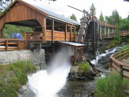 Dopoldne se ob spremljavi dežnih kapelj odpravimo naprej. Današnji cilj je Trollstigen, tako imanovana Dežela Trolčkov. Mimo Oppdala in skozi nacionalni park Dovrefjell. Zelo lepo, cesta pelje po planoti ob mogočni reki, ki se steka iz množice slapov z okoliških vrhov. Vse naokoli po planoti je polno lišajev svetlo rumene barve: Piha kar močan veter, motorista za nami pošteno zanaša po cesti. V mestu Dombas pretegnemo noge okoli zanimive cerkvice (N62,07475 / E9,12526) in nato zavijemo proti zahodu v smeri Andalsnesa. Ob poti vidimo značilen znak za naravno znamenitost (Sagelva) in se odločimo to zadevo pogledati. Po slabih dveh km ozke gozdne asfaltne ceste naletimo na star delujoč mlin in žago na vodo. Pravkar celo deluje in žagajo deske. Zelo zanimiva zadeva, vredna ogleda in slikanja (N62,27756 / E8,11903). Na srečo tukaj trenutno ne dežuje. V gozdu ob mlinu in žagi vse polno borovnic in nekaj kar precej velikih jurčkov. Po obiranju gozdnih sadežev se vrnemo na glavno cesto in skozi sotesko Romsdalen do mesta Andalsnes.