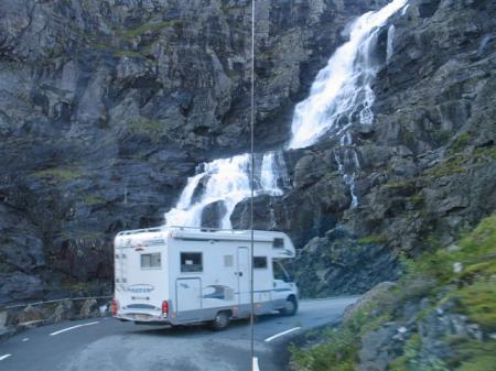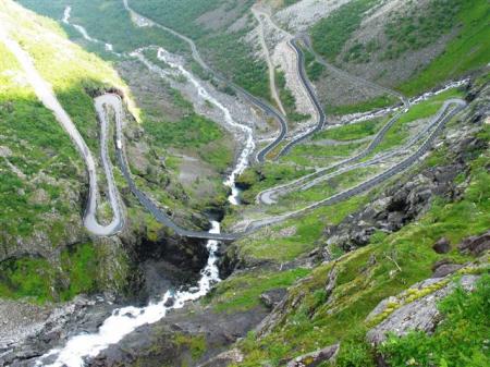 Zjutraj res ne dežuje več, oblaki se poskušajo trgati, videti je celo nekaj modrega neba. Mogoče je pa zgoraj pri Trolih sonce? Tik pred vzponom po serpentinah se Kranjcem vremena zjasnijo. Končno sonce, Trolčkova pot se nam prikaže v vsem svojem sijaju. Zgoraj množica trgovinic s spominki privablja turiste. Nekaj slik z razgledne ploščadi navzdol na znane serpentine in že smo na poti čez bližnji prelaz in nato navzdol po lepi dolini do trajekta čez Storfjorden. Ob poti navzdol opazim kar nekaj primernih počivališč za tiste, ki jih tu ujame spanec.
