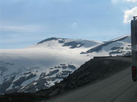 Po plovbi hud vzpon na kakih 1000 mnv, nekje vmes mi GPS javi, da sem na točki najlepšega razgleda na fjord. Čudno, nikjer ga ne vidim? Posveti se mi, ko plačamo 70 NOK (8.8 €) in se izven glavne ceste po dobrem makadamu in po še hujših serpentinah brez stranskih zaščitnih ograj pripeljemo na Dalsnibbo, 1500 mnv visoko parkirišče in razgledno točko, kjer se res lepo vidi fjord in vsi okoliški zasneženi hribi. Prej smo bili tik ob tej točki, vendar kakih 800 m nižje. Te odbite ceste in razgleda res ni za zamuditi! Spust je še najbolje izvesti v prvi prestavi. V lepem okolju nekaj km naprej na velikem parkingu (N62,01376 / E7,40221) si pripravimo kosilo. Tukaj se moramo odločiti ali takoj v smeri Lillehammra ali narediti še kakšen ovinek. Prevlada Lillehammer.